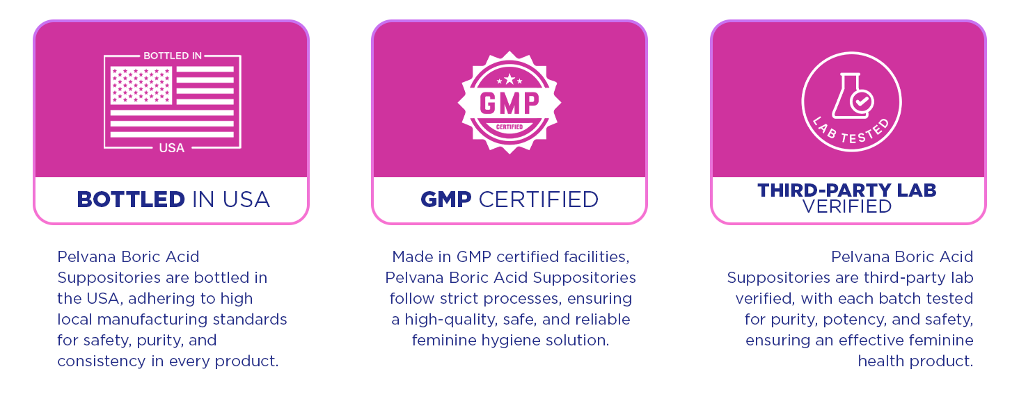 Each 600 mg boric acid suppository is individually packaged for hygiene and convenience. Use the included applicator to insert one suppository vaginally—ideally at bedtime—wear a panty liner if desired and let it work while you rest. The vaginal pH test strips are easy to use and help you test before and after, empowering you with insights into your intimate health. Pelvana’s formulation is designed with women’s comfort and wellness in mind: free from GMOs, synthetic dyes, perfumes, and preservatives.