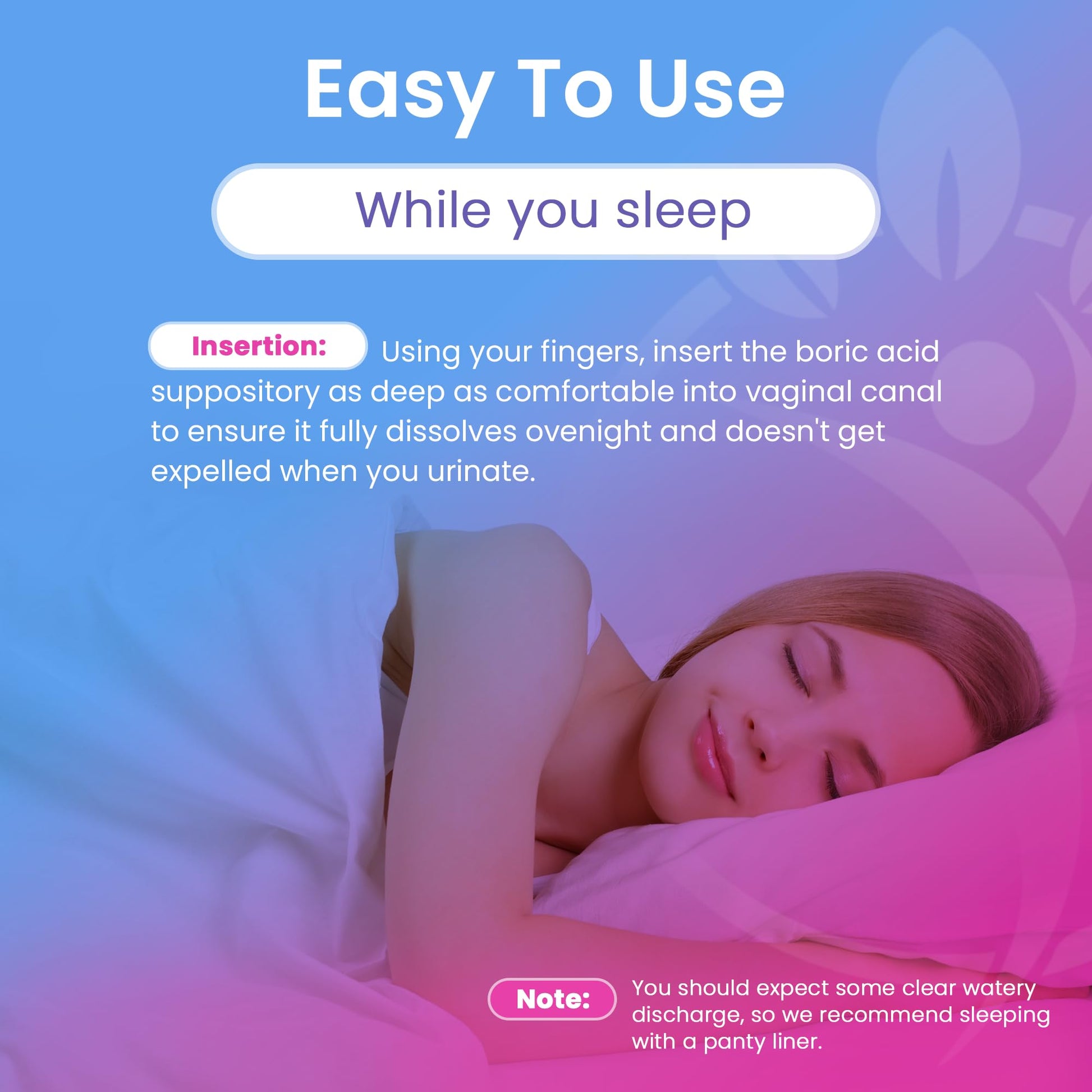 Boric acid vaginal suppositories work by supporting the natural acidic environment of the vagina, helping to promote microbial balance and reduce symptoms such as odor, itching, or unusual discharge. When used as directed, they offer a discreet overnight option when you want ease and comfort.