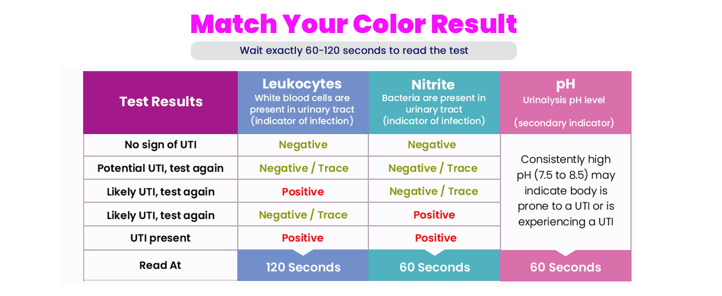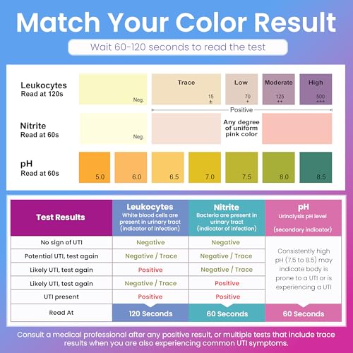 Each UTI test strip in this pack is formulated to detect key markers in urine — including leukocytes and nitrite — that are commonly associated with UTIs. The process is easy: collect or dip a strip in your urine, wait the recommended time, and compare against the color chart. Quick, discreet, and user-friendly.
